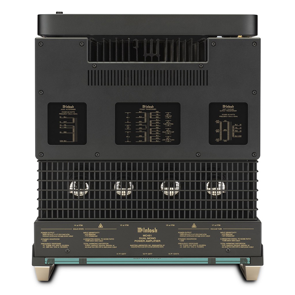 - esclusivo design Dual Monoblock, costituito da due unità di amplificazione distinte e indipendenti combinate in un unico chassis, una valvolare per le alte/medie frequenze da 150 Watt (su 2, 4 e 8 Ohm) con trasformatori d'uscita Unity Coupled e una a stato solido Quad Balanced per le basse frequenze da 300 Watt (su 2, 4 e 8 Ohm) con trasformatori di uscita Autoformer;