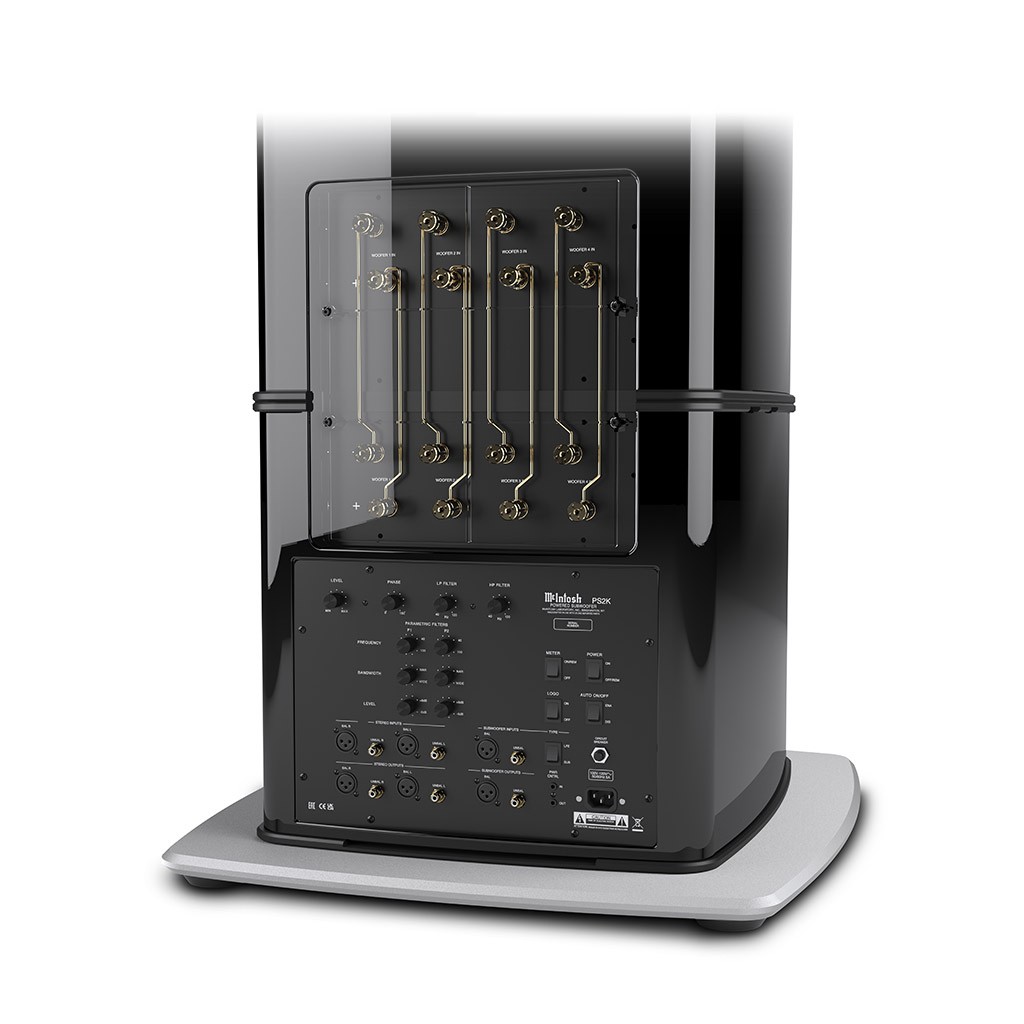 - 4x amplificatori ultra performanti in Classe D da 500 Watt dedicati a ciascun altoparlante, per una potenza complessiva di 2000 Watt, meticolosamente calibrati per riprodurre le basse frequenze con distorsione infinitesimale e con trasparenza, controllo, dinamica e impatto impeccabili, alloggiati in un apposito modulo disaccoppiato dagli altoparlanti e collocato in prossimità della base dei diffusori, dotato di ampio display VU-Meter dall'iconico design McIntosh;