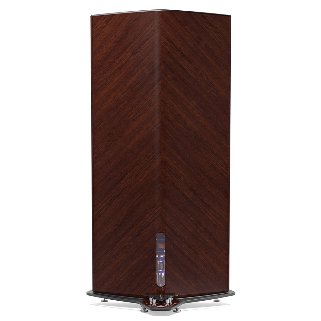 - cabinet disegnato a partire dal celebre baffle con ampia superficie a sviluppo latitudinale, con finitura lignea di pregiatissimo valore che ricopre l'intero corpo del diffusore, rivisitato passando dalla forma ellittica a quella pentagonale per consentire lo sviluppo interno delle innovative tecnologie incorporate e per garantire prestazioni inimitabili, con una ricostruzione del palcoscenico virtuale senza precedenti;