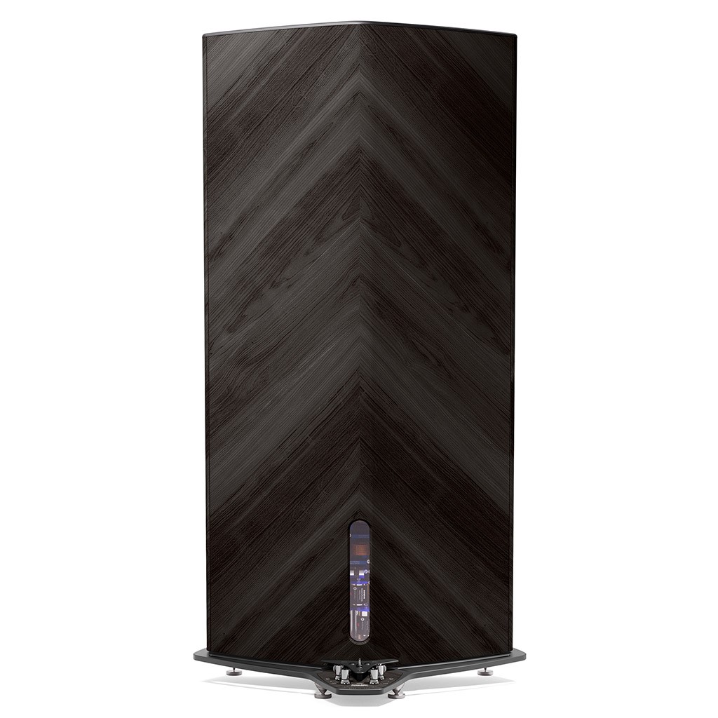 - cabinet disegnato a partire dal celebre baffle con ampia superficie a sviluppo latitudinale, con finitura lignea di pregiatissimo valore che ricopre l'intero corpo del diffusore, rivisitato passando dalla forma ellittica a quella pentagonale per consentire lo sviluppo interno delle innovative tecnologie incorporate e per garantire prestazioni inimitabili, con una ricostruzione del palcoscenico virtuale senza precedenti;